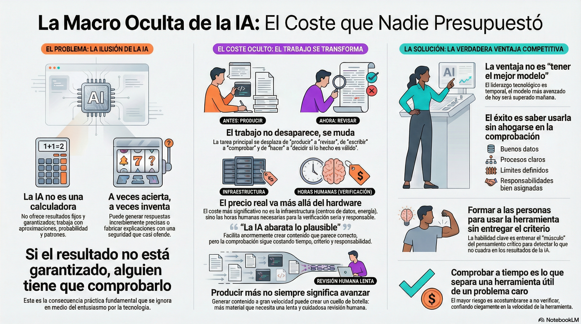 Y ahí es donde el hilo del podcast se volvió útil de verdad. Porque el coste grande no es solo “cuánto cuesta generar una respuesta”. El coste grande, el que casi nunca sale en portada, es cuánto cuesta usar esto en serio. Usarlo en serio no es sacar un texto que suena bien, o una tabla que parece profesional, o un informe con tono de consultora. Usarlo en serio es meterlo dentro de un proceso donde hay consecuencias, donde alguien firma, donde el error no es una anécdota graciosa sino una llamada, un problema, un “¿esto quién lo ha aprobado?”.